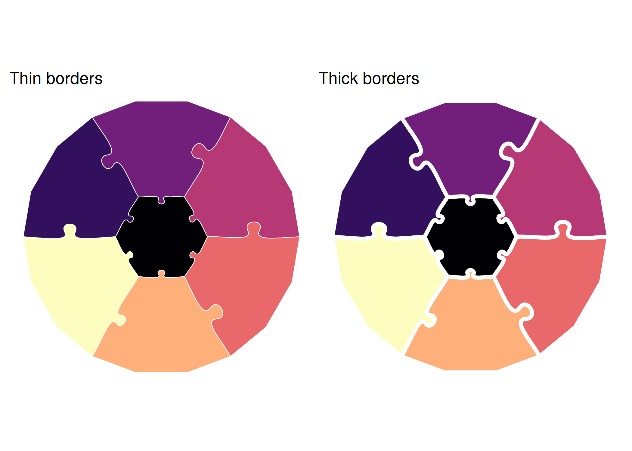 print(make_border_demo(0.25, "Thin borders") + make_border_demo(1.5, "Thick borders"))